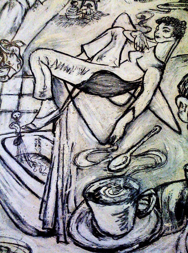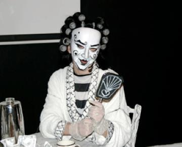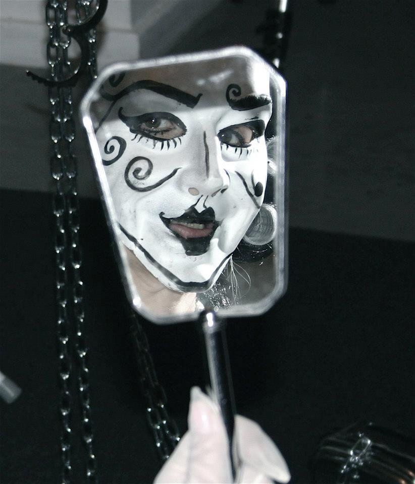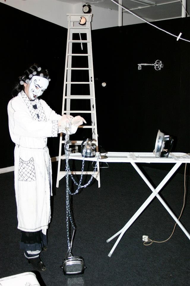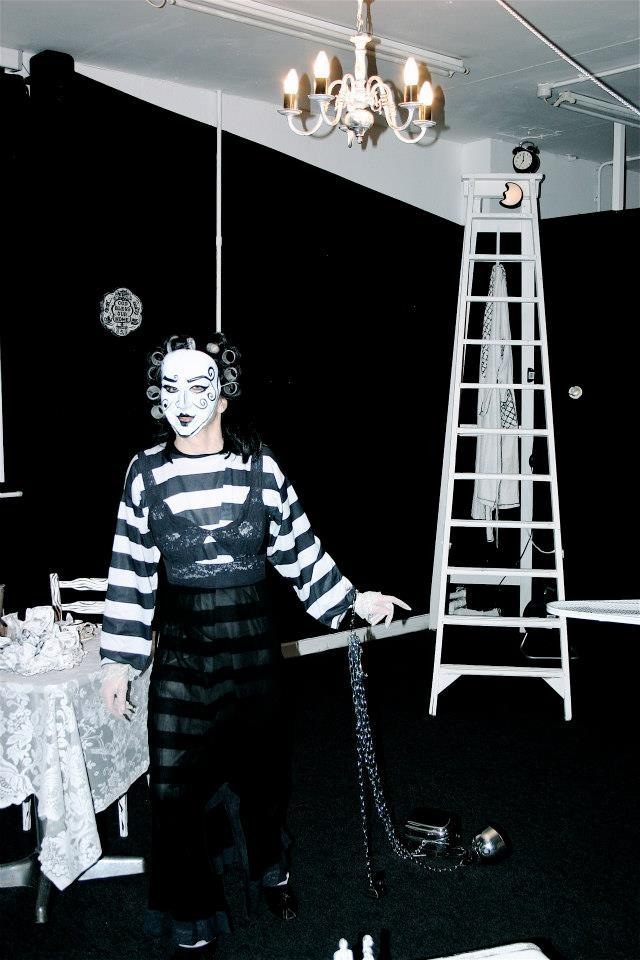 A series of photos from Performance Installation. It represents a three dimensional drawing in space, hence the Black and White is important to define as a drawing. It is a social satire on the desintegration of the american dream. I am symbol for every wo=man, the story of a woman going through the stage of domestic bliss, realises that she is living in a B&W world, mundane, repetitive, a shadow, and the daily drudgery of being a house wife.She awakens up one day, to realise she wants her freedom and breaking the routine of her daily chores.She metamorphosis into a powerful, vibrant, sexual and independant woman! Free from the constraints of mariage.